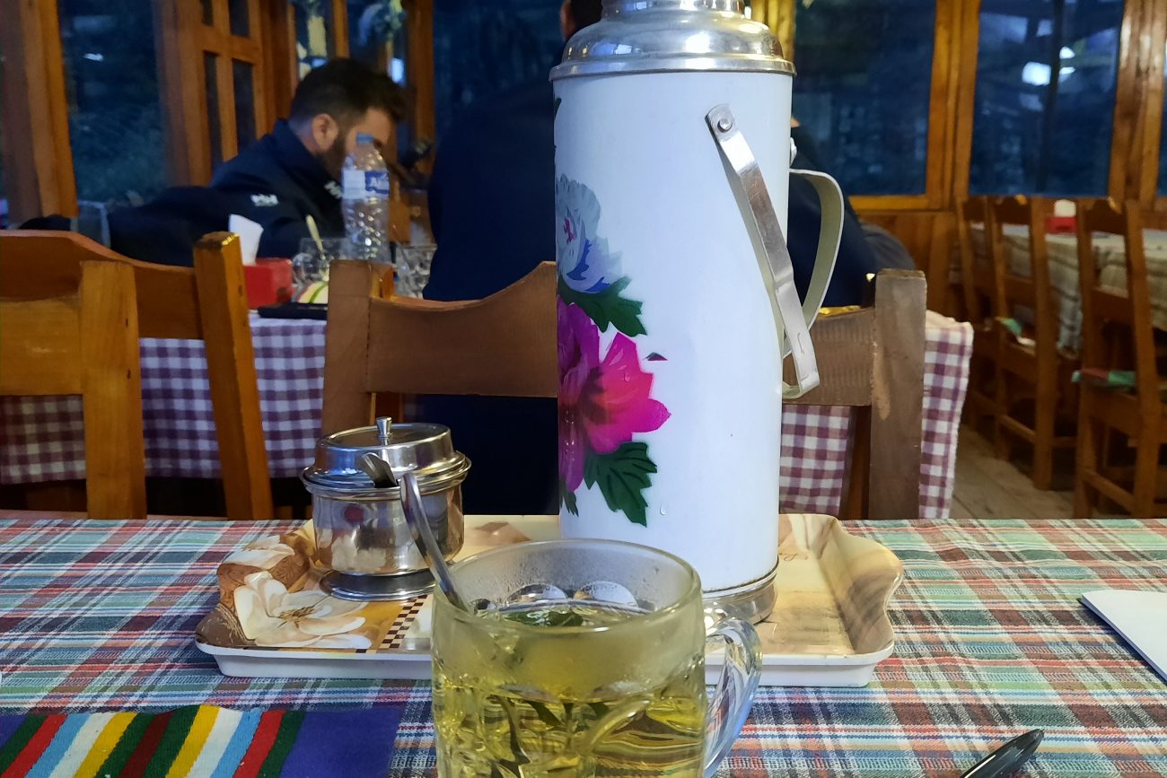 Ich bin kurz eingenickt, short nap to recover 😉 Jetzt sitze ich im Gastraum, in der Dining Hall, wie das hier überall genannt wird. Ich habe einen Minztee bestellt. Frische Minze natürlich aus dem Garten hinterm Haus. Es geht mir besser. Das Kopfzerbrechen über den Pass habe ich mit einer Frage an den Gastgeber beendet: „Will I need spikes to cross Larke Pass?“. Die Antwort: „No, nowadays no snow, no ice.“. Alles entspannt also: Kein Schnee, kein Slippery 🙂