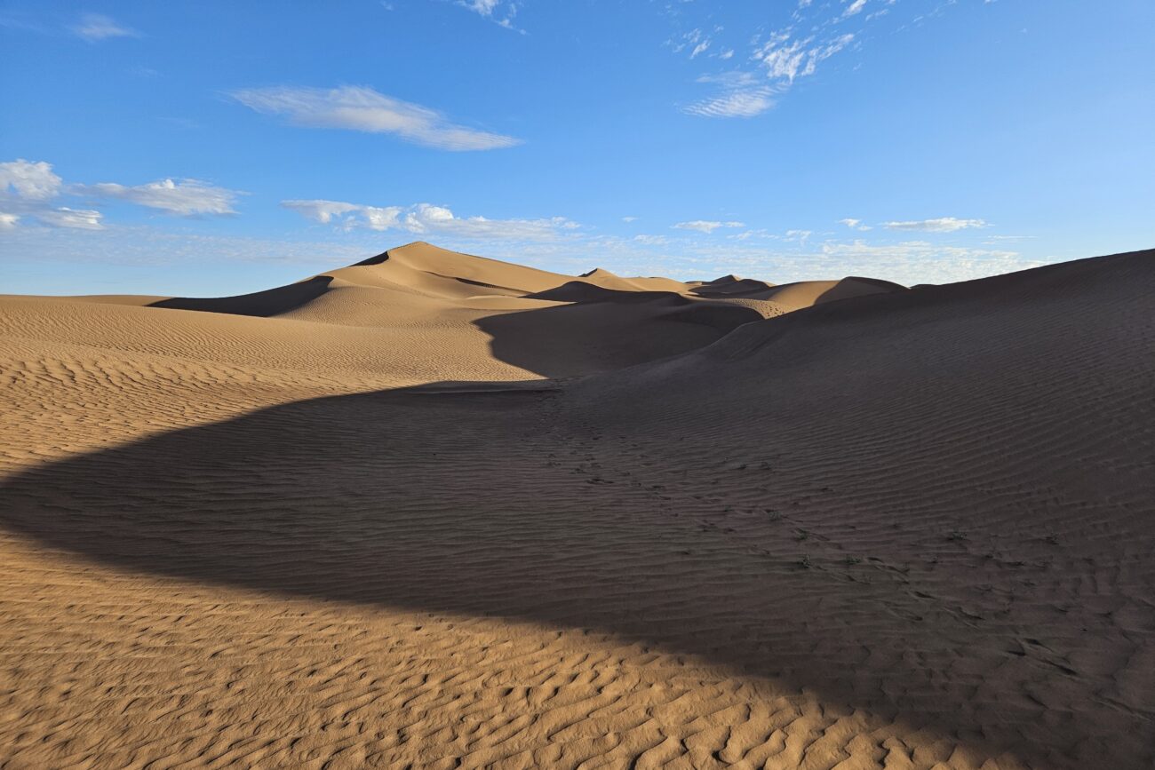 Jeder Tag begann in der kühlen Morgendämmerung, wenn die ersten Sonnenstrahlen die Dünen in goldenes Licht tauchten. Während die Kamele mit Proviant und Ausrüstung beladen wurden, saßen wir beim Frühstück mit frischem Brot, das am Abend gebacken wurde, dazu Eier, Marmelade und Mandelmus. Vor uns lag ein Tag voller Herausforderungen – und unvergesslicher Eindrücke.