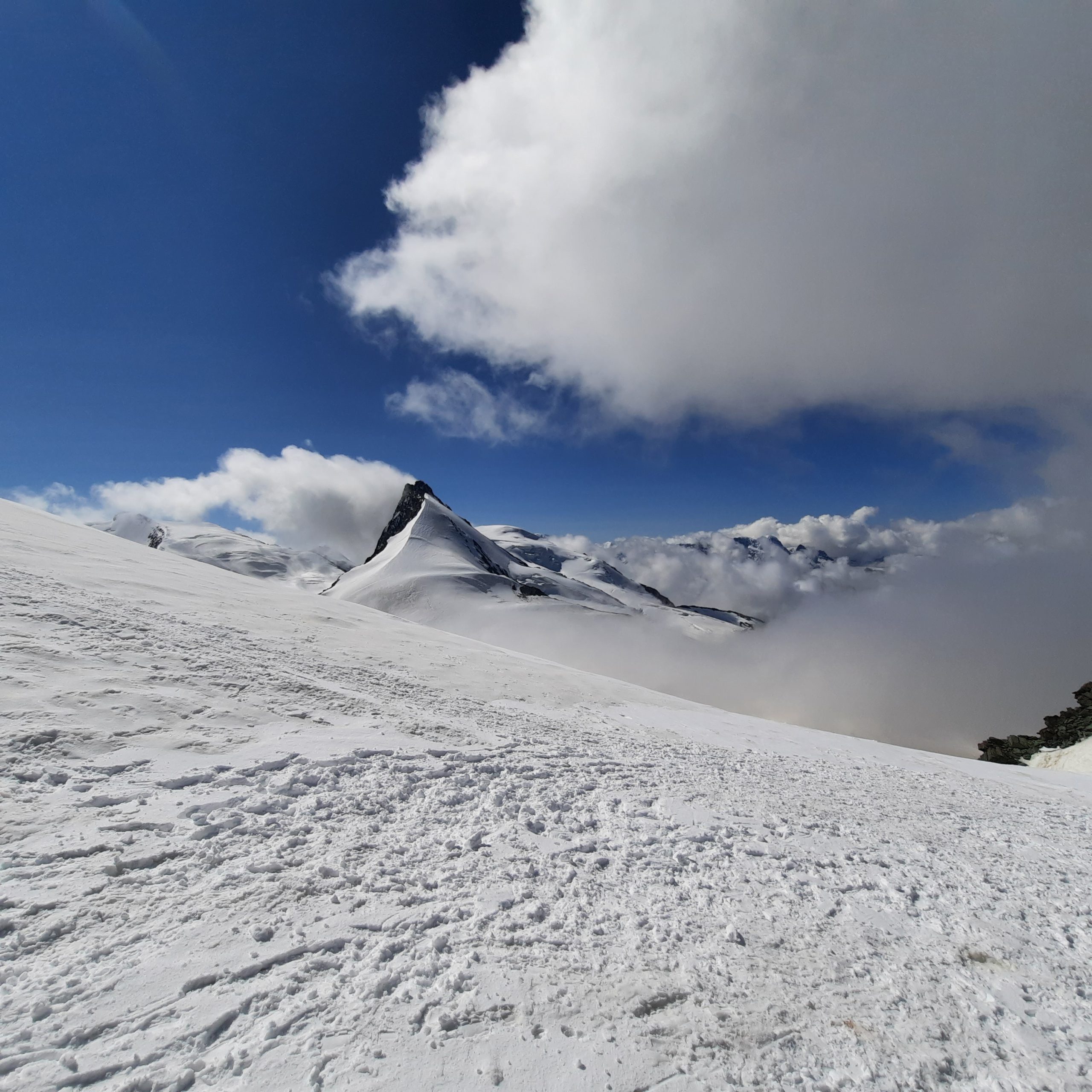 Ich sitze auf 3.100m im Bergrestaurant Hohsaas und schau auf den Gletscher. Ich habe die Auf- und Abstiegsspuren im...